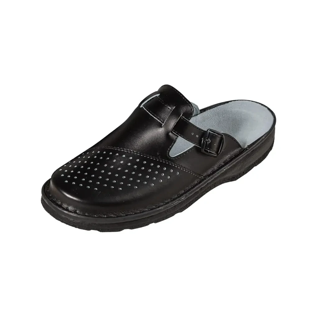 - Skórzana cholewka z perforacją zapewnia trwałość i odporność na codzienne mycie i dezynfekcję
