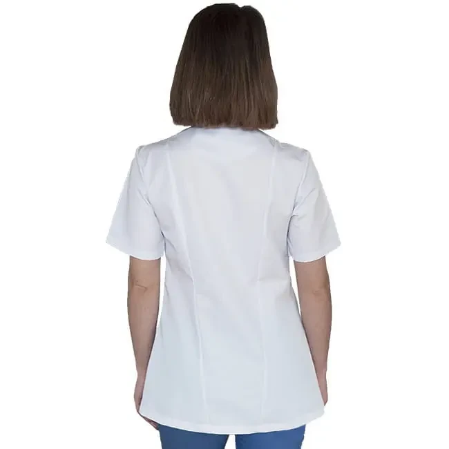 Niezwykle elegancka bluza medyczna zapewniająca profesjonalny wygląd w pracy. Atrakcyjny wygląd osiągnięto dzięki pionowym cięciom modelującym oraz subtelnym, kontrastowym paskom na kieszeniach w kolorze błękitnym. Wygodne zapięcie na zamek. Doskonale sprawdzi się także w przypadku kosmetyczek, lekarzy, pielęgniarek a nawet w gastronomii.