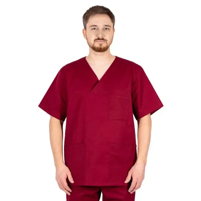 Bardzo funkcjonalna uniwersalna bluza medyczna w kolorze bordowym. Zakładana przez głowę. 3 praktyczne kieszenie umiejscowione na piersi i w okolicach bioder. Najbardziej sprawdzony i lubiany przez lekarzy fason z podkrojem szyi w kształcie litery V.