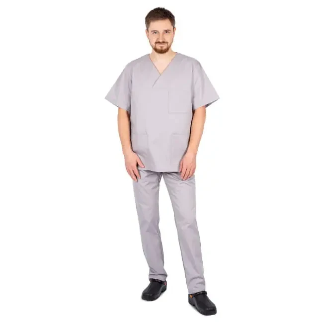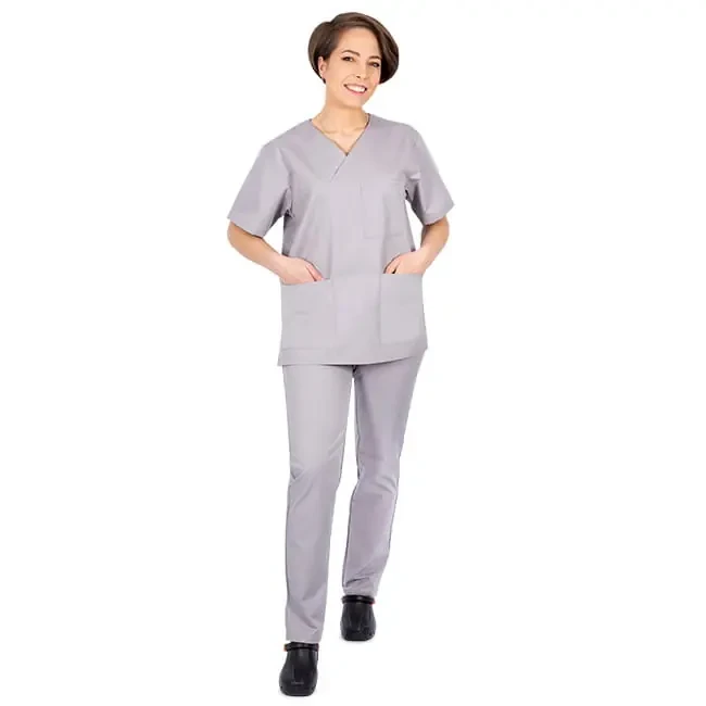 Bardzo funkcjonalne uniwersalne spodnie medyczne w kolorze popielatym. Prosty, sprawdzony i lubiany przez lekarzy fason z gumą dopasowującą.