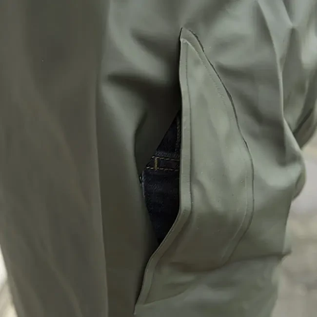 Spodnie posiadają sznurek, który umożliwia wygodne dopasowanie ich do pasa. Specjalne wycięcia pozwalają na korzystanie z kieszeni odzieży znajdującej się pod spodem (tzw. kieszenie przelotowe). Napy umieszczone na końcu nogawek dają możliwość ich zwężenia.