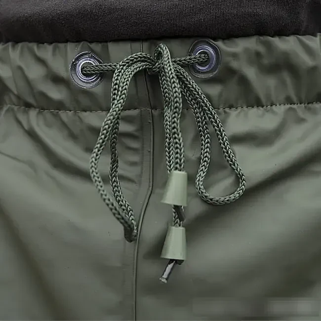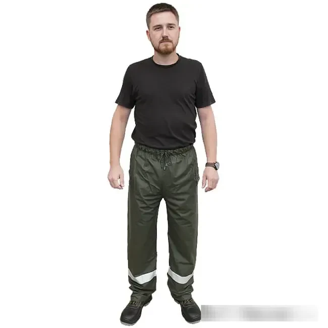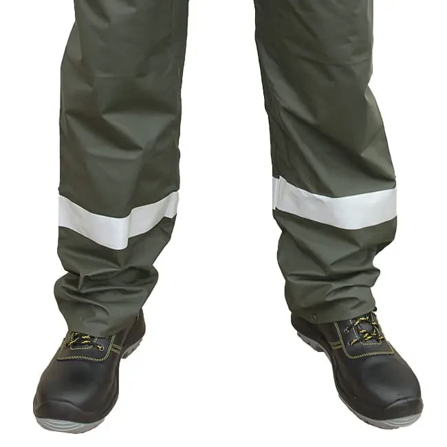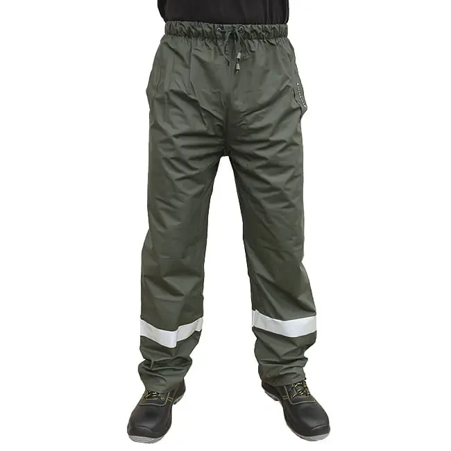 Zielone spodnie przeciwdeszczowe z taśmami odblaskowymi: